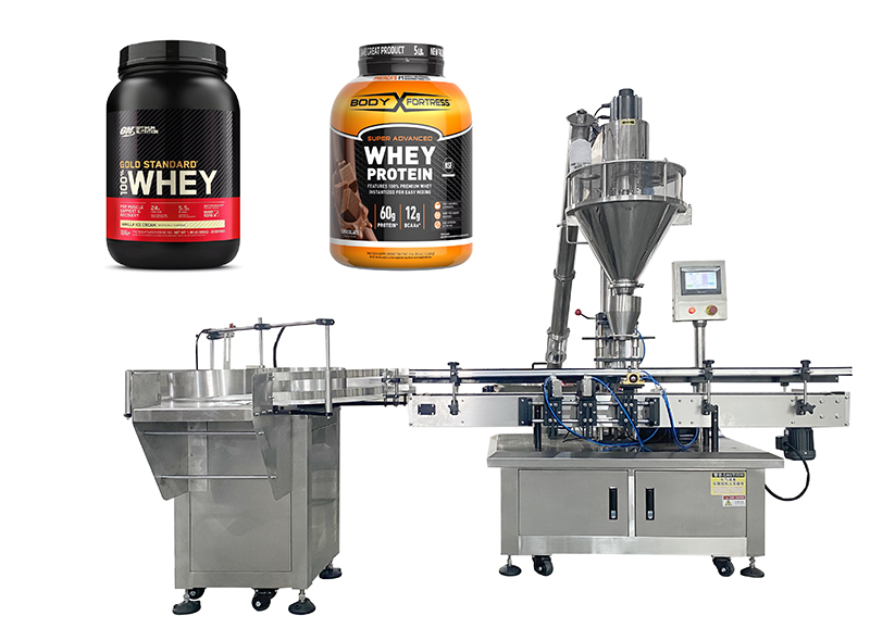 Colocación de contenedores: las latas o botellas vacías se colocan en el transportador de la máquina o en el área designada. Estos contenedores están listos para ser llenados con el producto en polvo.